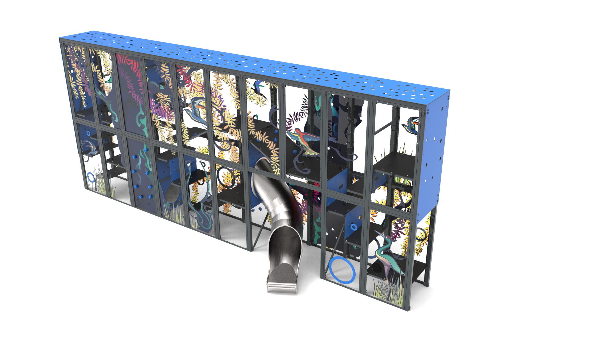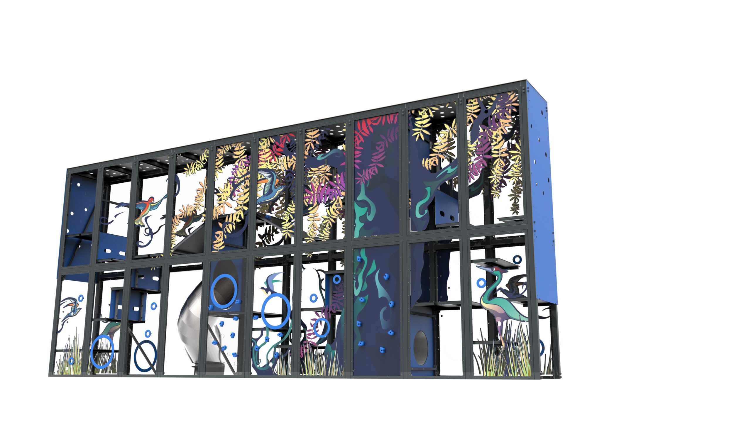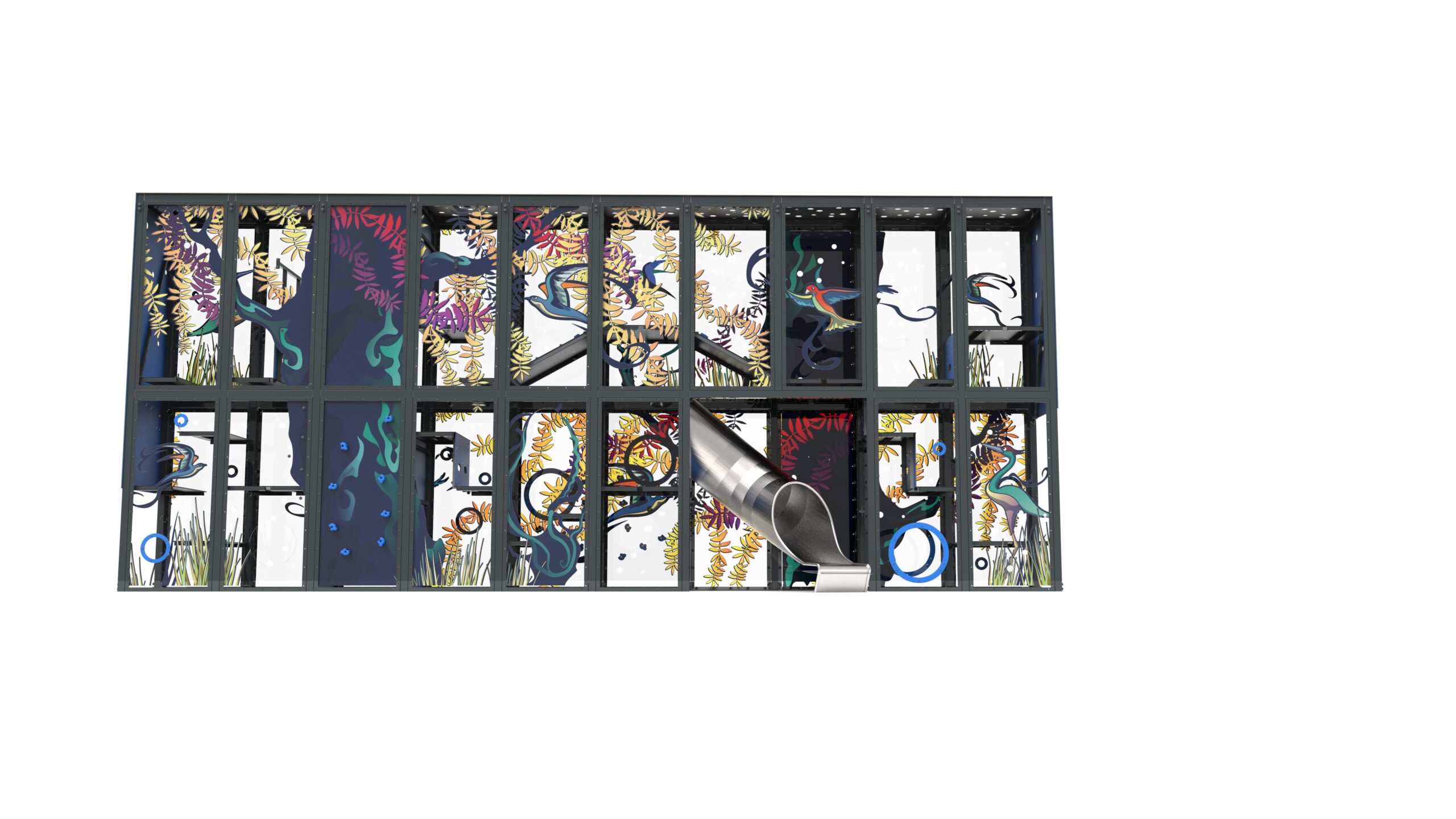 Urządzenie w formie pionowego labiryntu zbudowanego z podestów, przejść tunelowych i trapów. Dłuższe ściany wykonane z płyt poliweglanowych, z nadrukami UV, w ramach stalowych umożliwiających łatwą wymianę w razie wandalizmu.