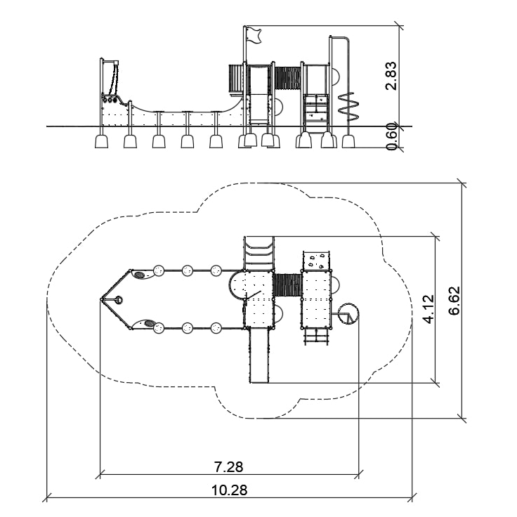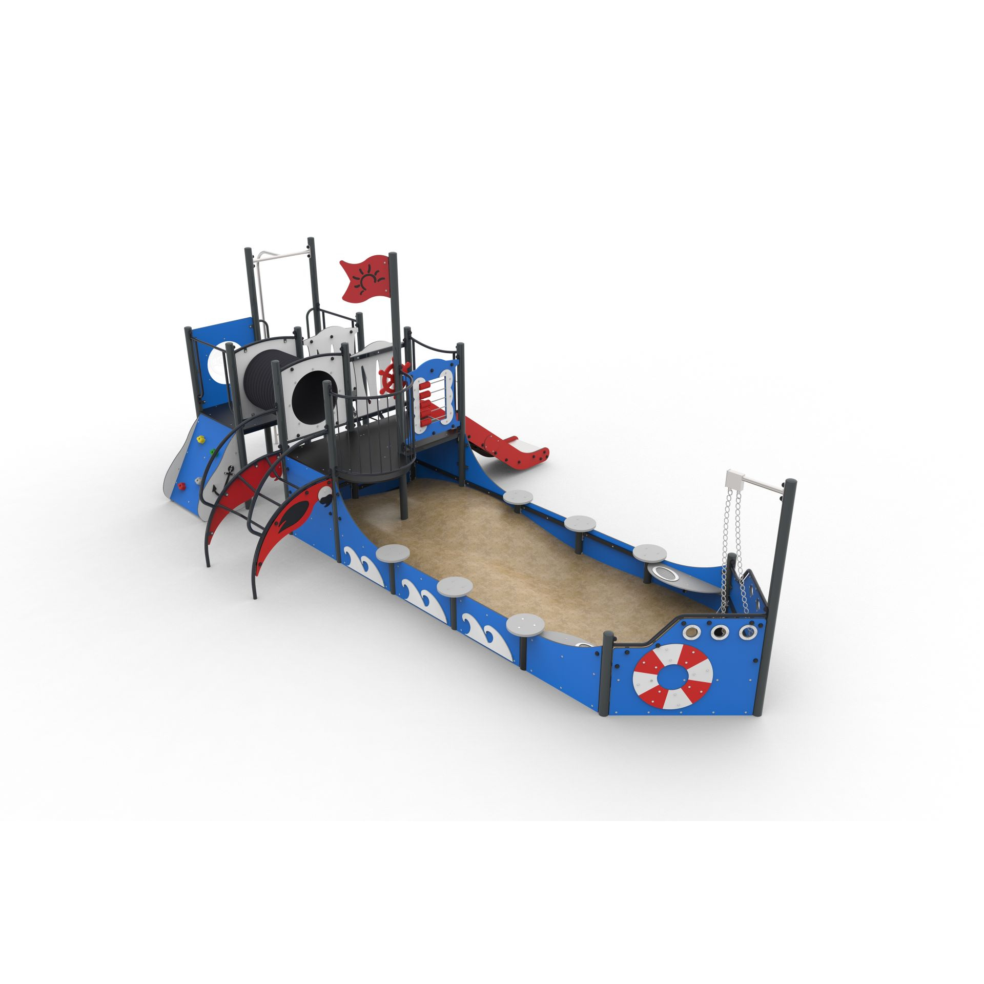 Устройство в форме корабля с выделенным местом для песочницы. Перила и площадки дополнительно усилены сварным стальным каркасом. Конструкционные колонны из круглых труб.